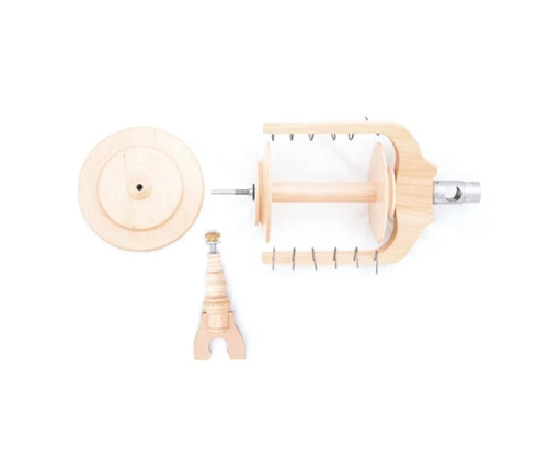 Extend the capabilities of your Kromski Minstrel wheel by adding a Jumbo Flyer Kit. You can quickly swap out your regular flyer for the jumbo unit (and back again). Here are the benefits: flyer with very large orifice 0.70 inch opening for heavy spinning and plying; much larger jumbo bobbin – holds 50 cubic inches of yarn; lower ratio ranges – 2 speeds – to give you excellent speed choices without changing flyer.